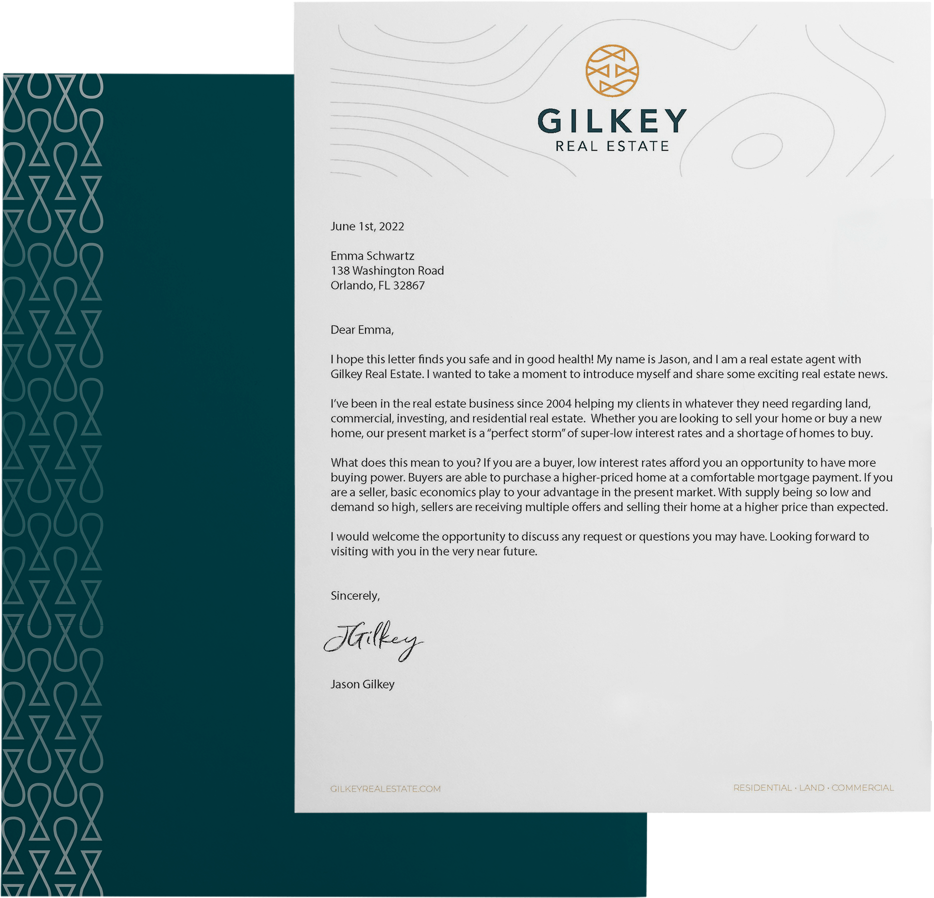 The visual identity was meticulously crafted across all collateral, incorporating custom patterns, rich hues, premium materials, and nuanced details to convey a sense of sophistication reflective of Gilkey Real Estate's high-quality service. Every touchpoint was carefully considered, ensuring it aligns with the customer experience while elegantly showcasing the brand's distinctiveness.