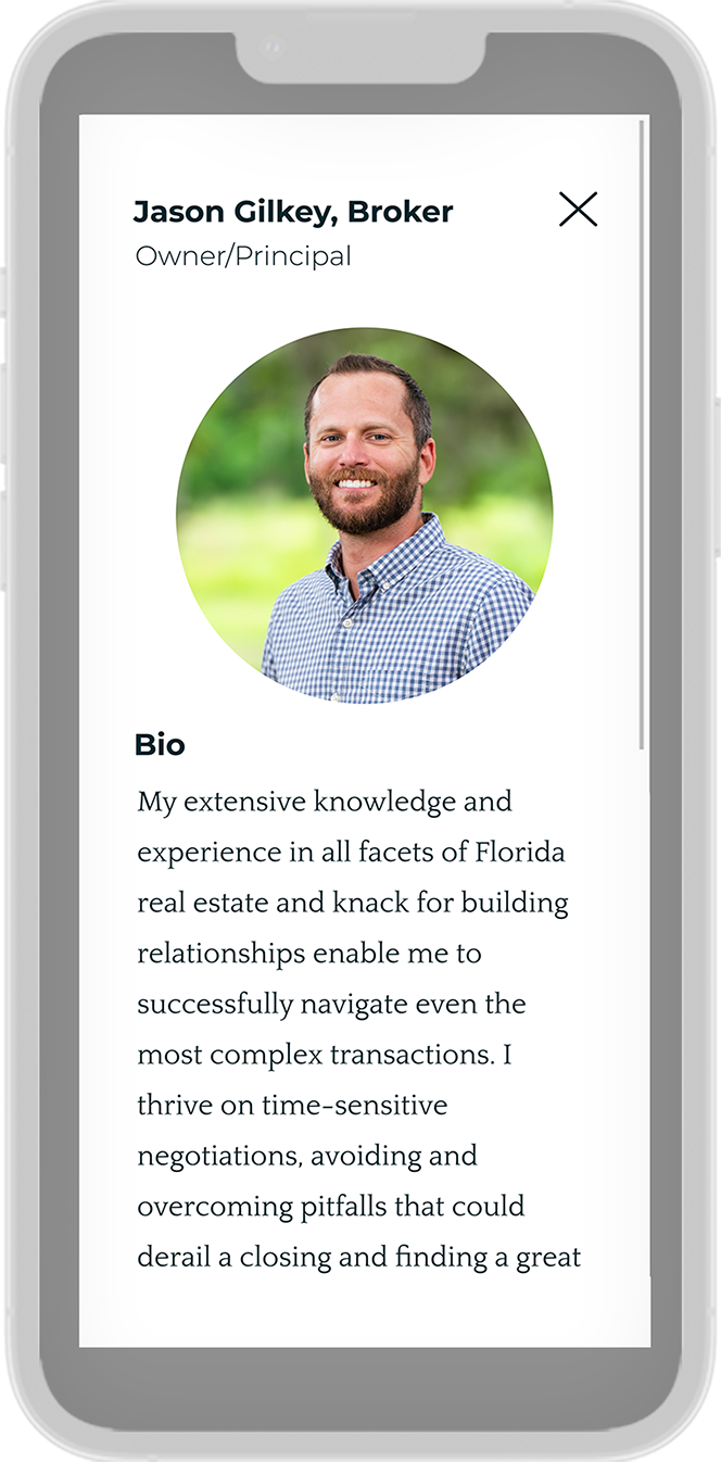 The minimalist design for the website perfectly mirrors the seamless process of working with Gilkey. By incorporating fluid transitions and thoughtfully curated copy, we strategically guide users through each section with ease. Our design captures the personal connection that people desire when working with realtors, as reflected in the brand elements and style of Gilkey Real Estate.